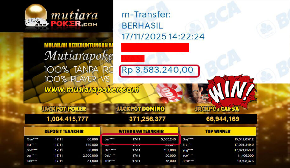 Bukti Withdraw ( 3,583,240,- ) Member Setia MutiaraPoker