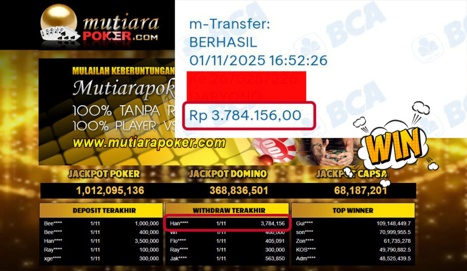 Bukti Withdraw ( 3,784,156,- ) Member Setia MutiaraPoker