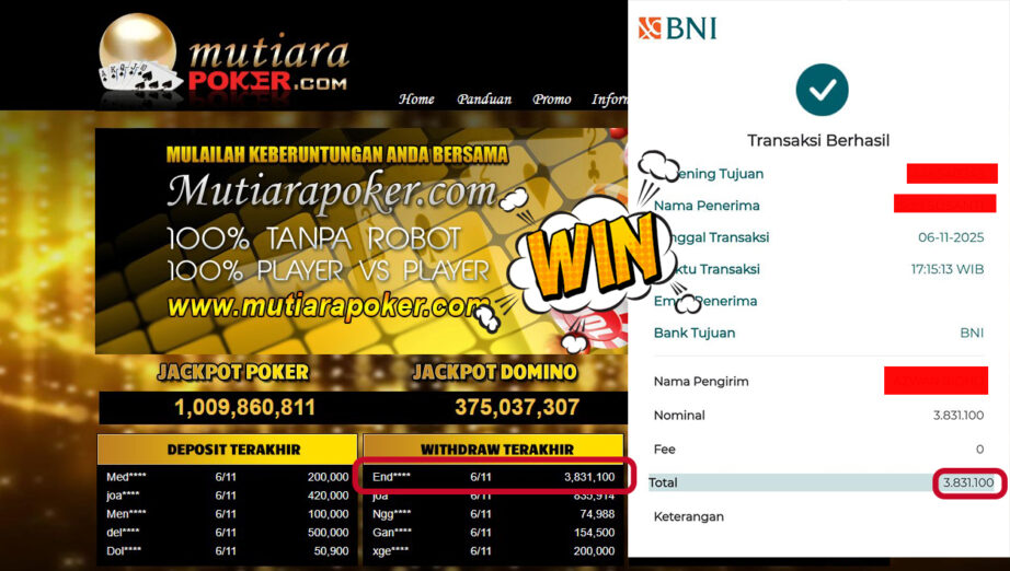Bukti Withdraw ( 3,831,100,- ) Member Setia MutiaraPoker