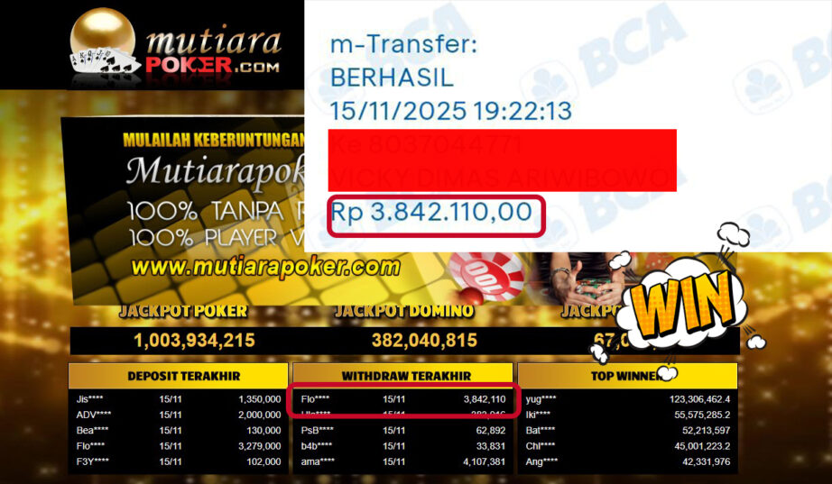 Bukti Withdraw ( 3,842,110,- ) Member Setia MutiaraPoker