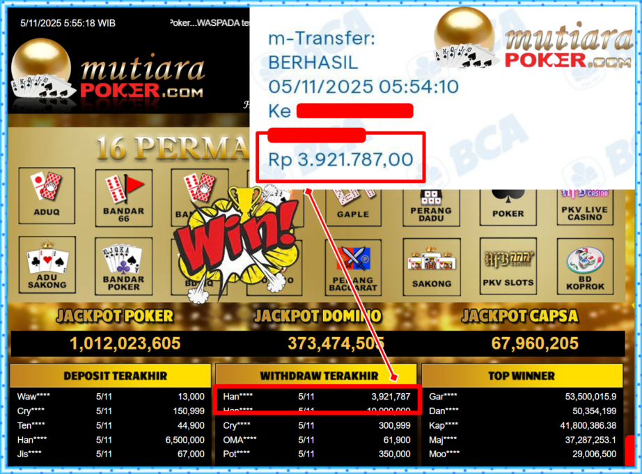 Bukti Withdraw ( 3,921,787,- ) Member Setia MutiaraPoker
