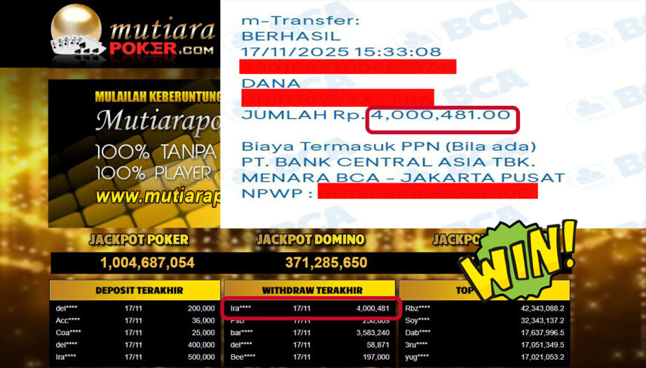 Bukti Withdraw ( 4,000,481,- ) Member Setia MutiaraPoker