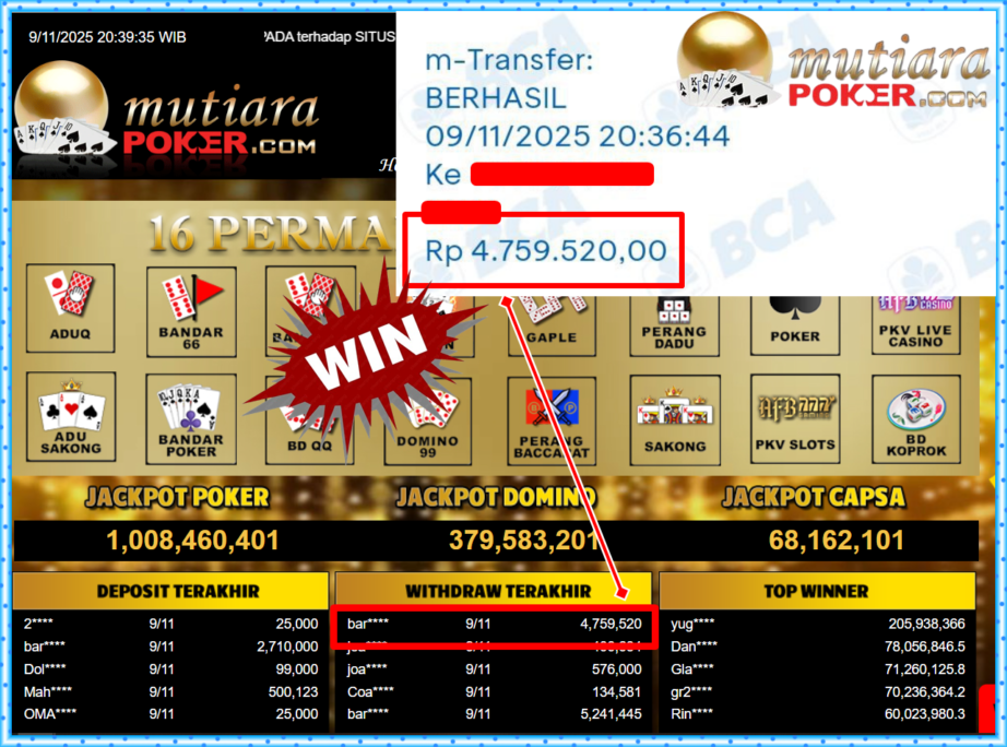 Bukti Withdraw ( 4,759,520,- ) Member Setia MutiaraPoker