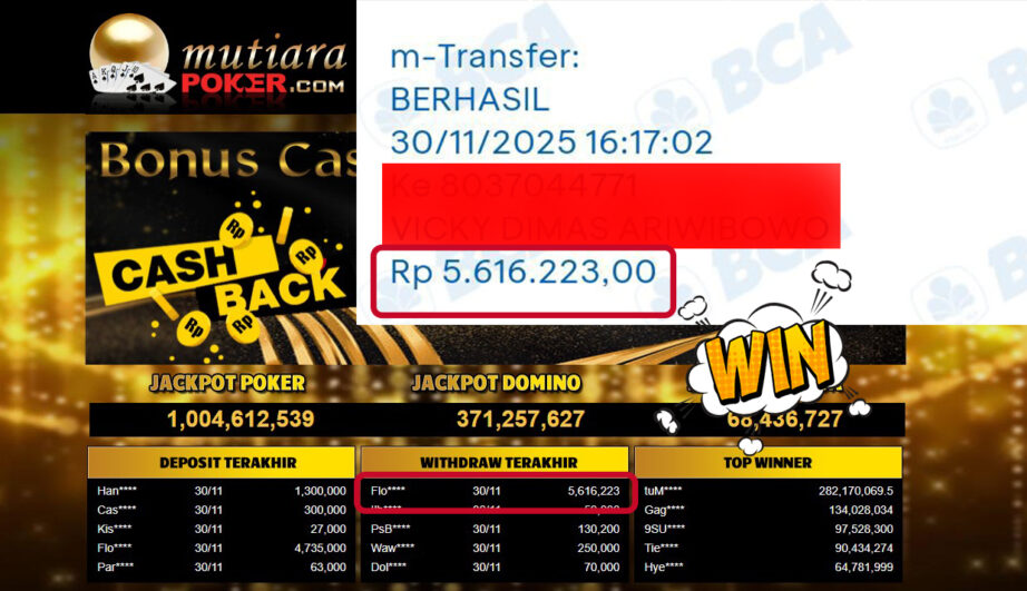 Bukti Withdraw ( 5,616,223,- ) Member Setia MutiaraPoker