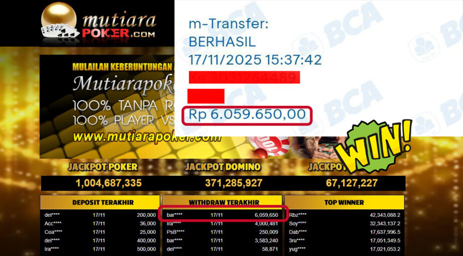 Bukti Withdraw ( 6,059,650,- ) Member Setia MutiaraPoker