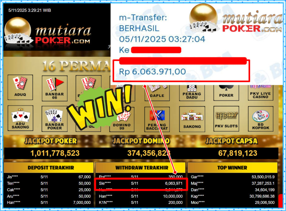 Bukti Withdraw ( 6,063,971,- ) Member Setia MutiaraPoker