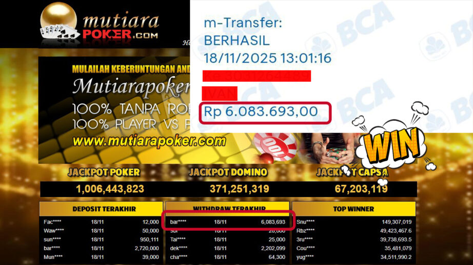 Bukti Withdraw ( 6,083,693,- ) Member Setia MutiaraPoker