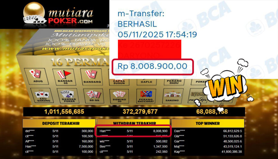 Bukti Withdraw ( 8,008,900,- ) Member Setia MutiaraPoker