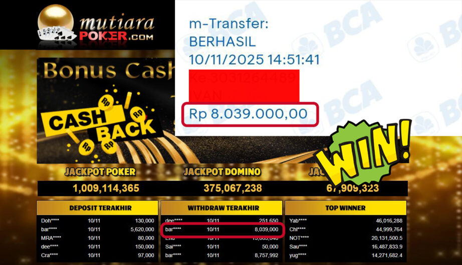 Bukti Withdraw ( 8,039,000,- ) Member Setia MutiaraPoker