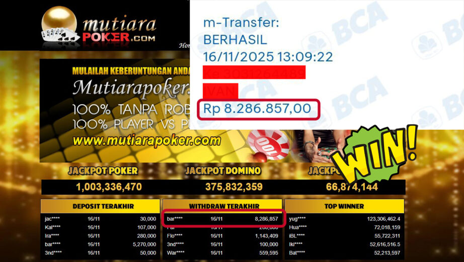 Bukti Withdraw ( 8,286,857,- ) Member Setia MutiaraPoker