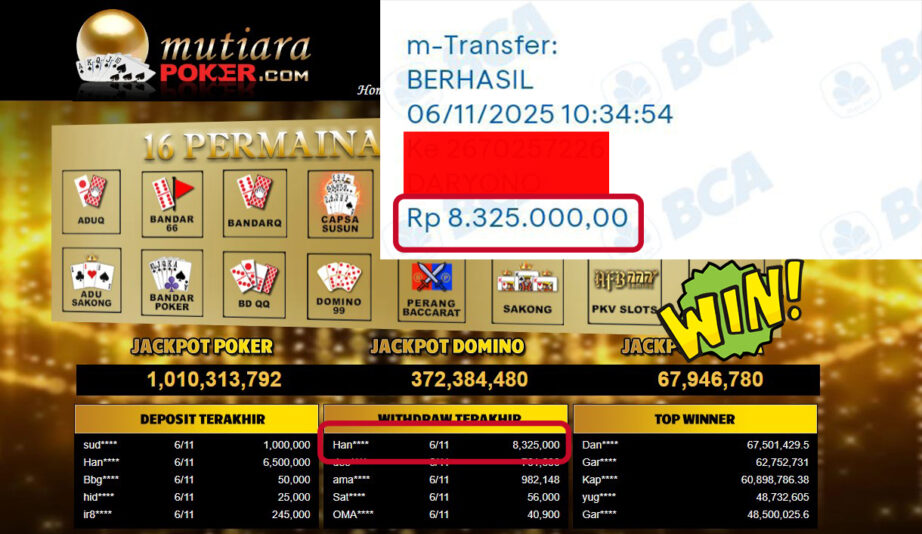 Bukti Withdraw ( 8,325,000,- ) Member Setia MutiaraPoker
