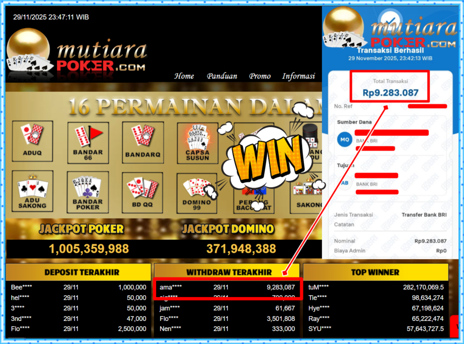 Bukti Withdraw ( 9,283,087,- ) Member Setia MutiaraPoker