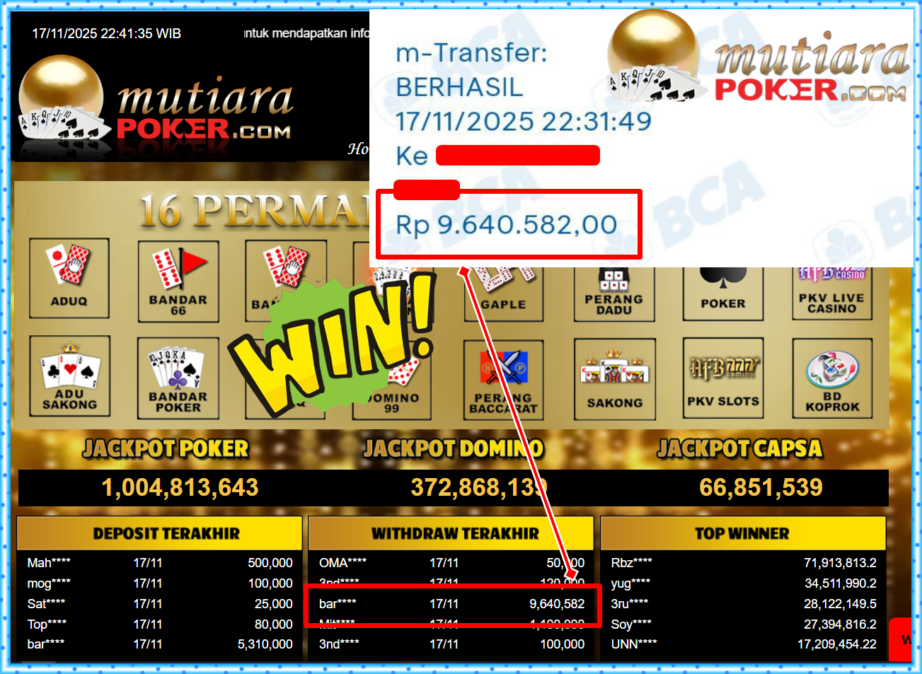 Bukti Withdraw ( 9,640,582,- ) Member Setia MutiaraPoker