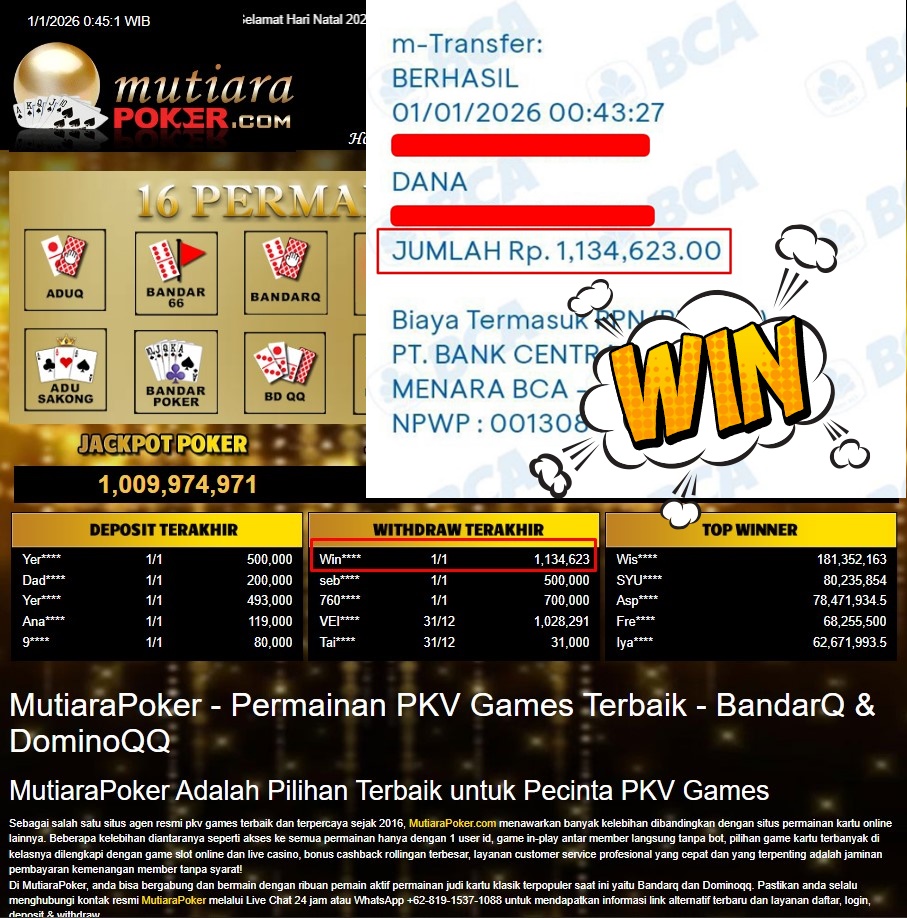 Bukti Withdraw ( 1.134.623,- ) Member Setia MutiaraPoker