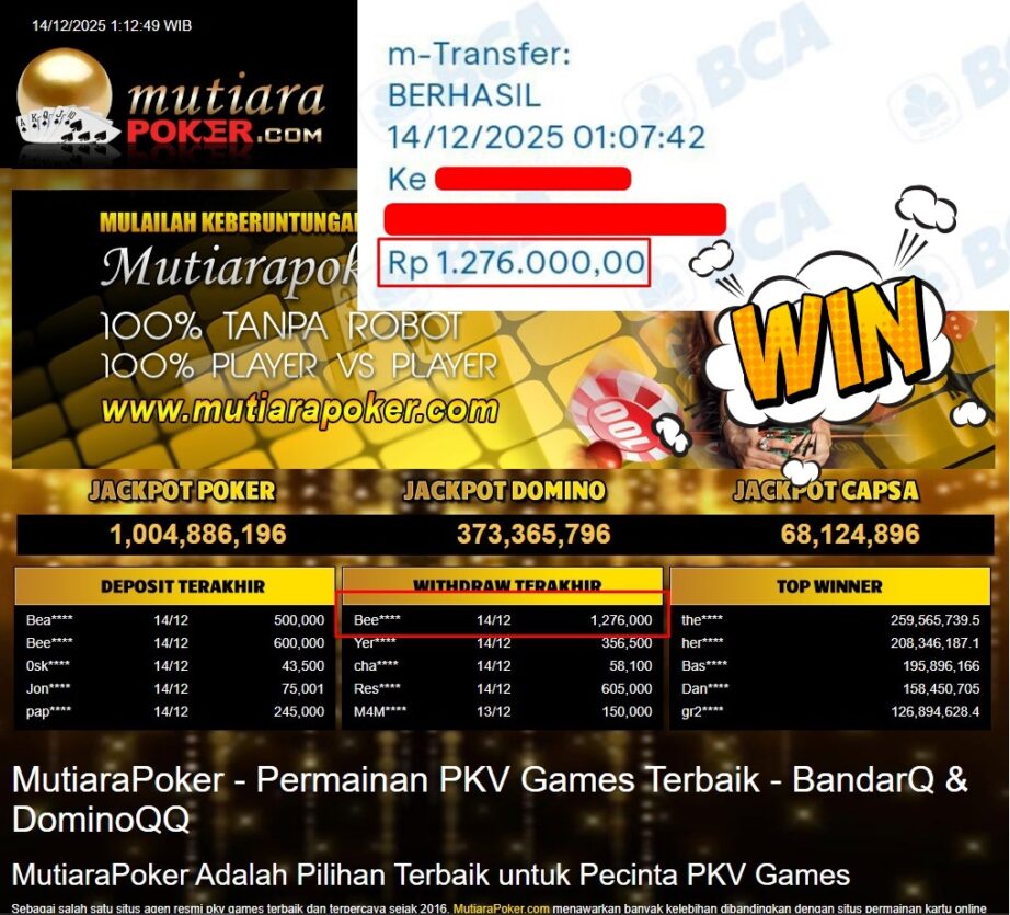 Bukti Withdraw ( 1.276.000,- ) Member Setia MutiaraPoker