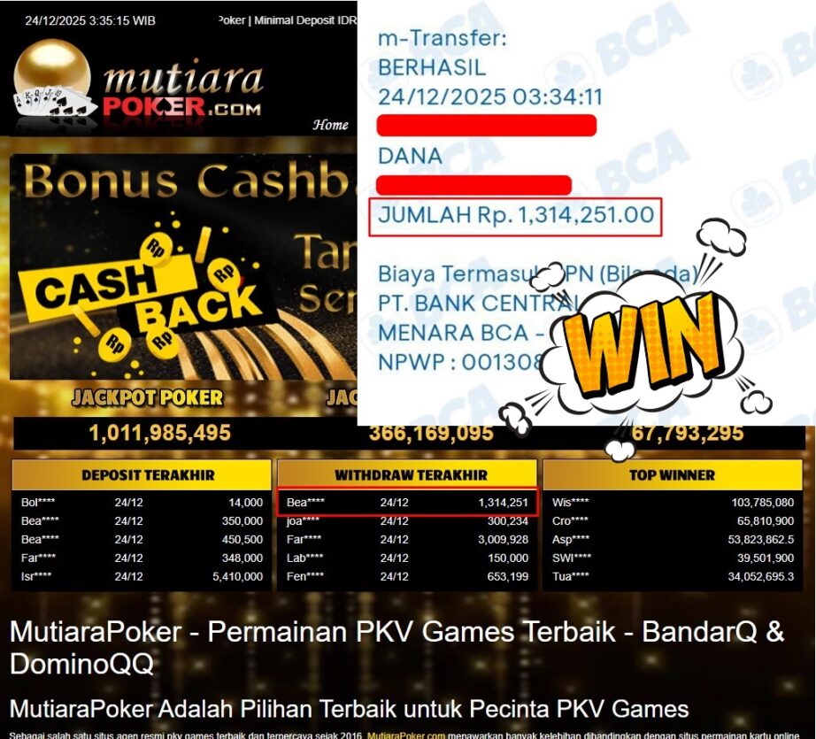 Bukti Withdraw ( 1.314.251,- ) Member Setia MutiaraPoker
