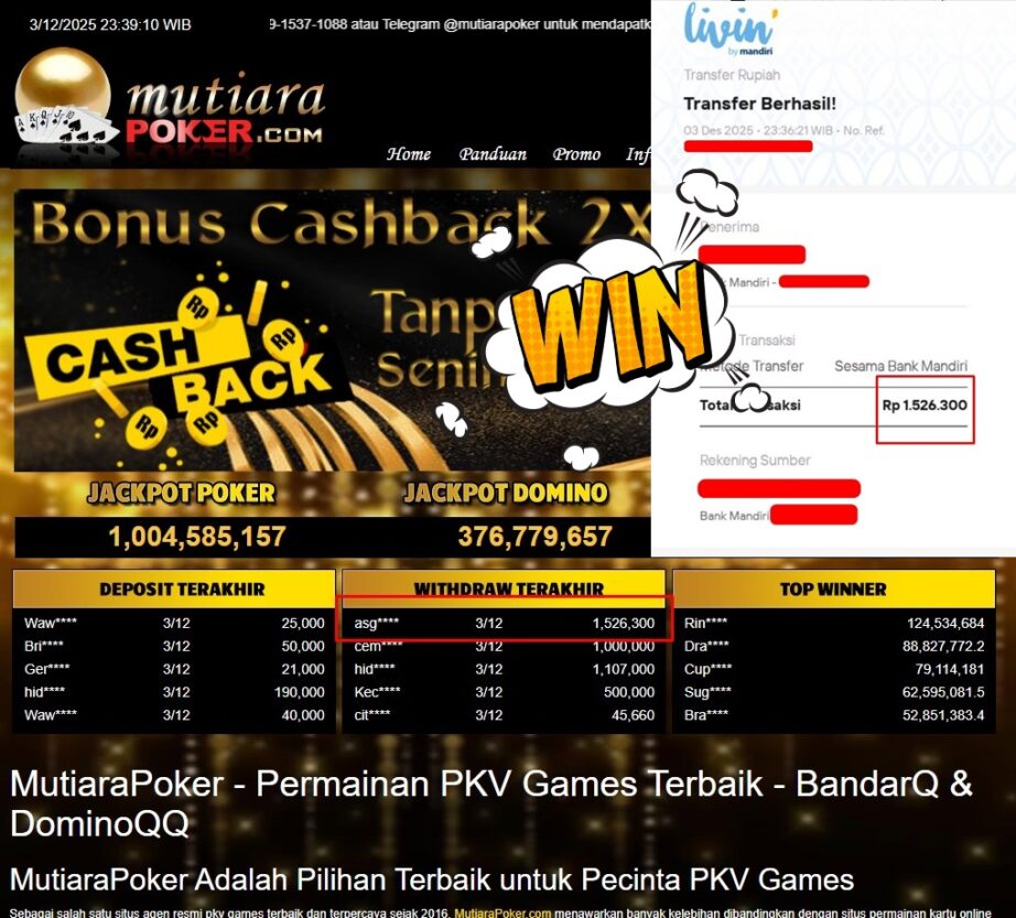 Bukti Withdraw ( 1.526.300,- ) Member Setia MutiaraPoker