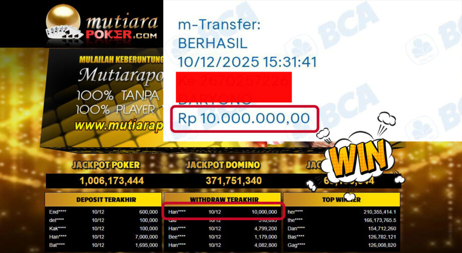 Bukti Withdraw ( 10,000,000,- ) Member Setia MutiaraPoker