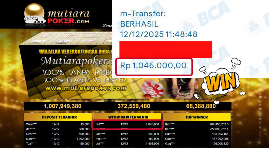 Bukti Withdraw ( 1,046,000,- ) Member Setia MutiaraPoker