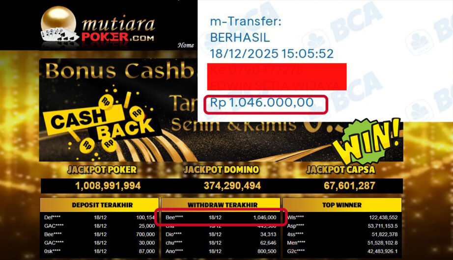 Bukti Withdraw ( 1,046,000,- ) Member Setia MutiaraPoker