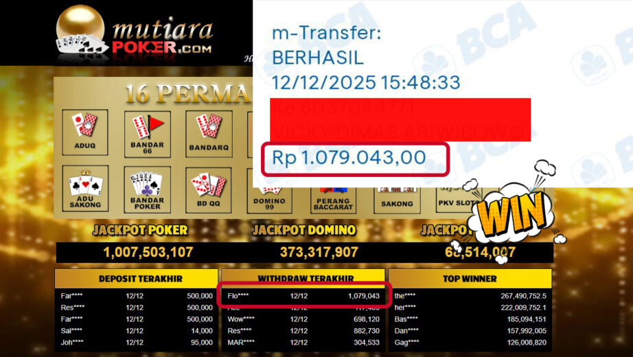 Bukti Withdraw ( 1,079,043,- ) Member Setia MutiaraPoker