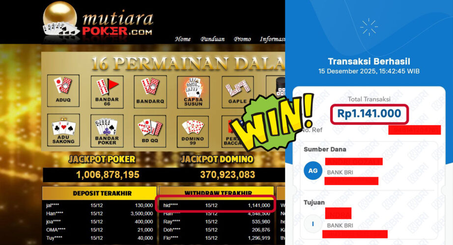 Bukti Withdraw ( 1,141,000,- ) Member Setia MutiaraPoker