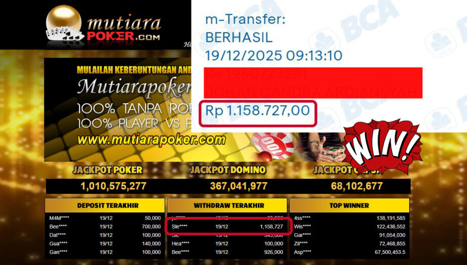 Bukti Withdraw ( 1,158,727,- ) Member Setia MutiaraPoker
