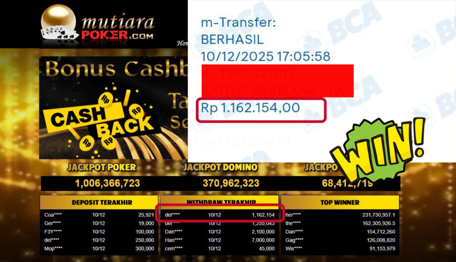 Bukti Withdraw ( 1,162,154,- ) Member Setia MutiaraPoker