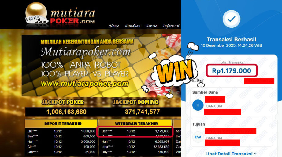 Bukti Withdraw ( 1,179,000,- ) Member Setia MutiaraPoker