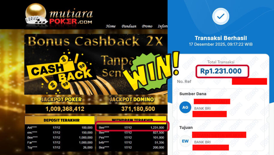 Bukti Withdraw ( 1,231,000,- ) Member Setia MutiaraPoker
