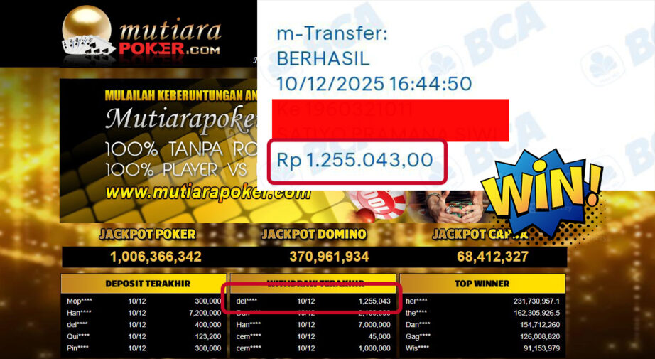 Bukti Withdraw ( 1,255,043,- ) Member Setia MutiaraPoker
