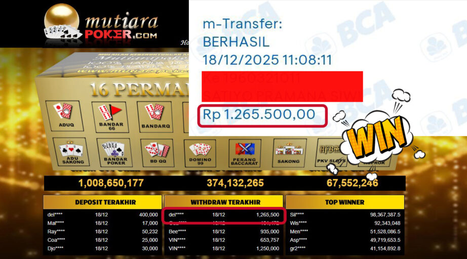 Bukti Withdraw ( 1,265,500,- ) Member Setia MutiaraPoker