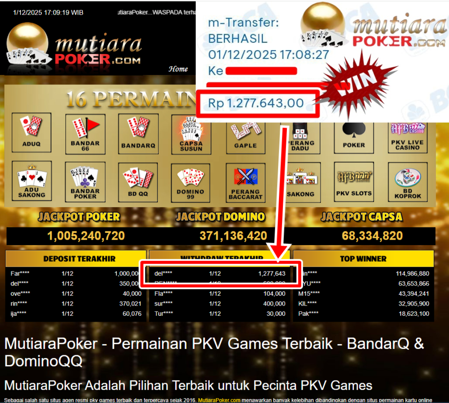 Bukti Withdraw ( 1,277,643,- ) Member Setia MutiaraPoker
