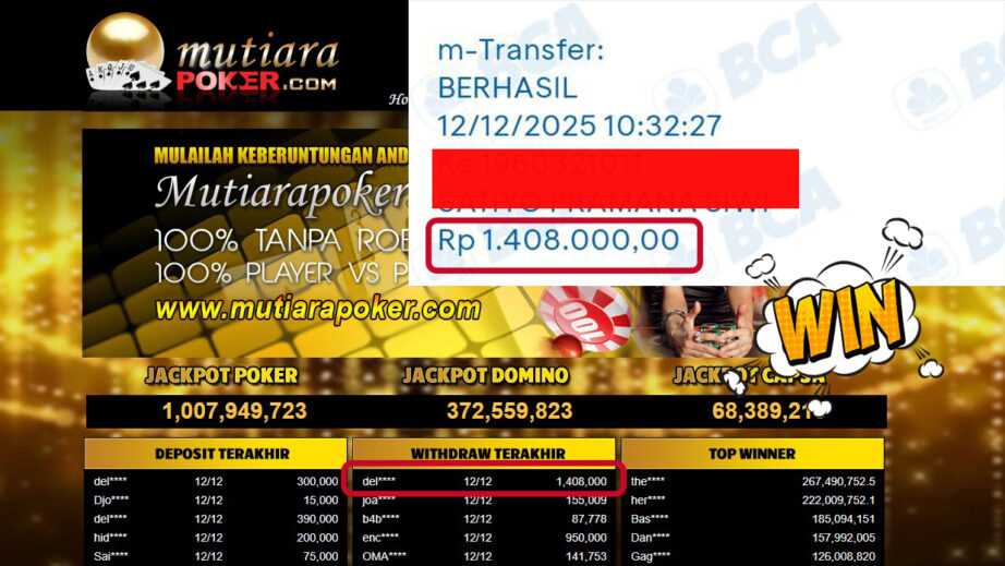 Bukti Withdraw ( 1,408,000,- ) Member Setia MutiaraPoker