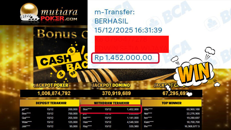 Bukti Withdraw ( 1,452,000,- ) Member Setia MutiaraPoker