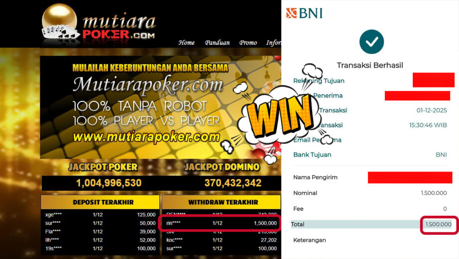 Bukti Withdraw ( 1,500,000,- ) Member Setia MutiaraPoker