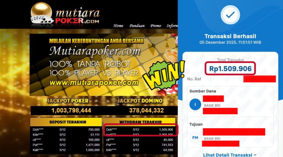 Bukti Withdraw ( 1,509,906,- ) Member Setia MutiaraPoker