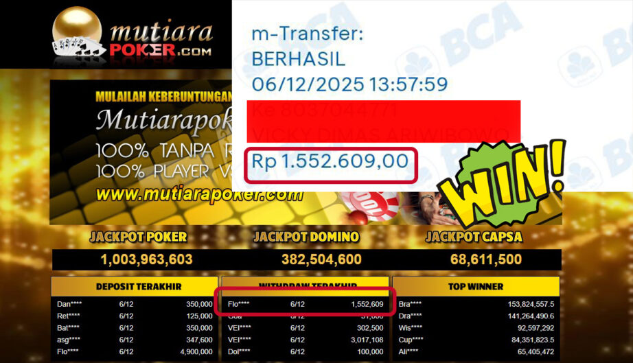 Bukti Withdraw ( 1,552,609,- ) Member Setia MutiaraPoker