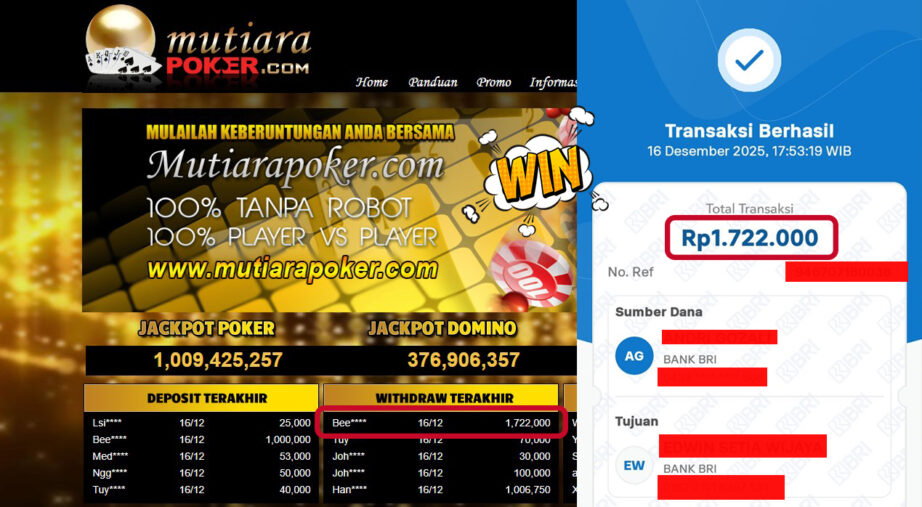Bukti Withdraw ( 1,722,000,- ) Member Setia MutiaraPoker