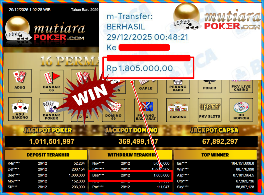 Bukti Withdraw ( 1,805,000,- ) Member Setia MutiaraPoker