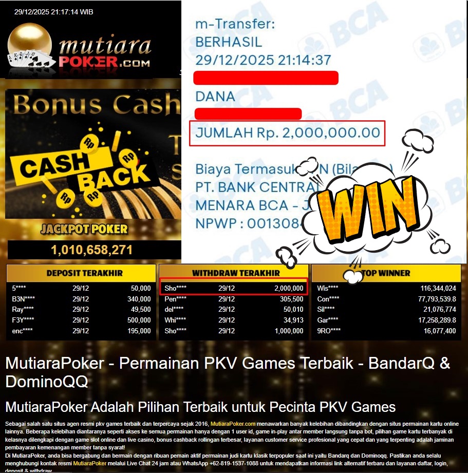 Bukti Withdraw ( 2.000.000,- ) Member Setia MutiaraPoker