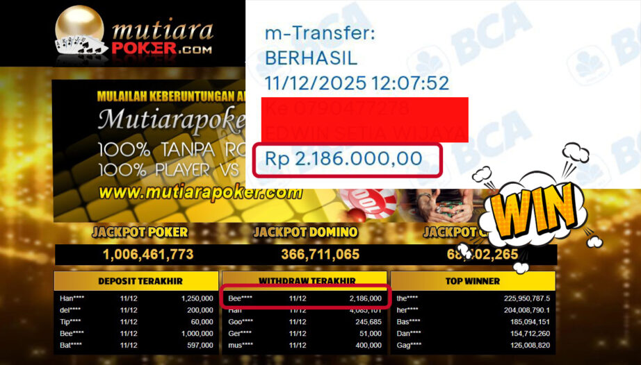 Bukti Withdraw ( 2,186,000,- ) Member Setia MutiaraPoker