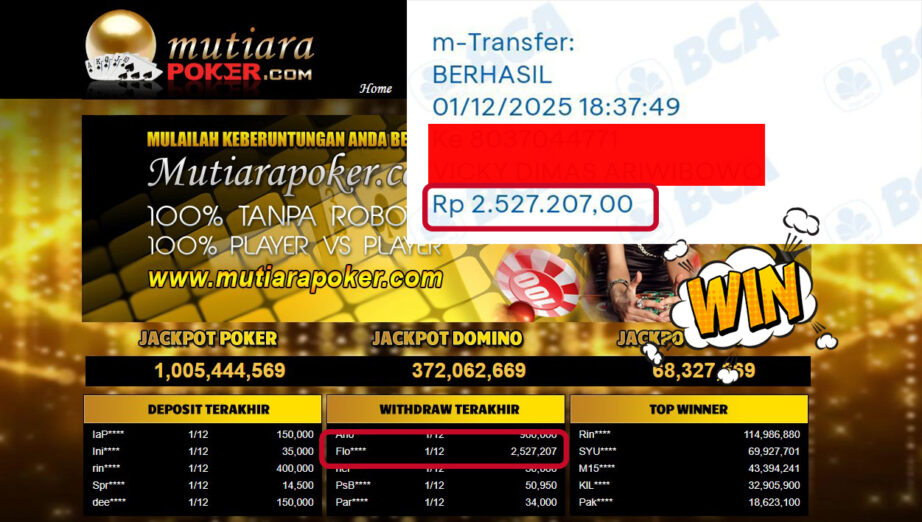 Bukti Withdraw ( 2,527,207,- ) Member Setia MutiaraPoker