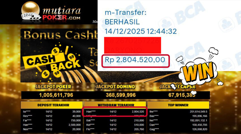 Bukti Withdraw ( 2,804,520,- ) Member Setia MutiaraPoker