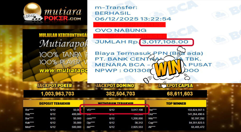 Bukti Withdraw ( 3,017,108,- ) Member Setia MutiaraPoker