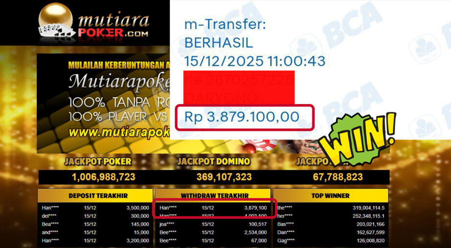 Bukti Withdraw ( 3,879,100,- ) Member Setia MutiaraPoker