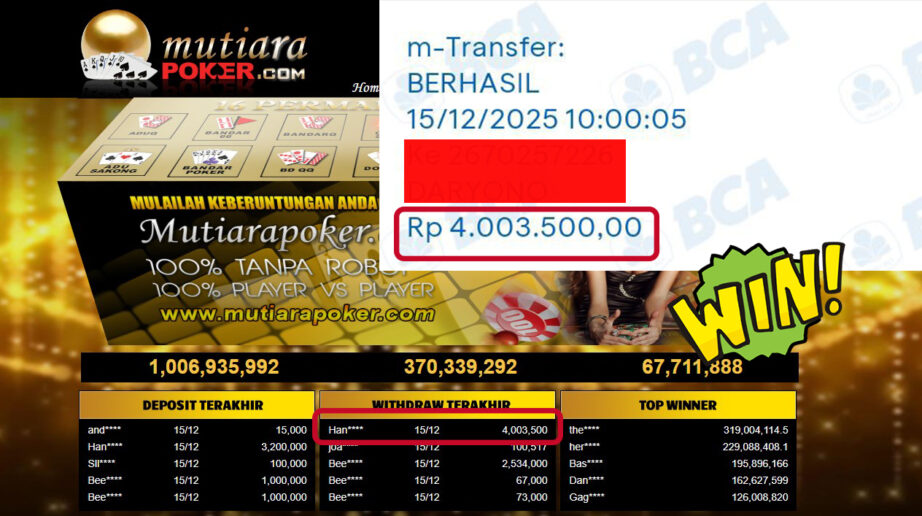 Bukti Withdraw ( 4,003,500,- ) Member Setia MutiaraPoker