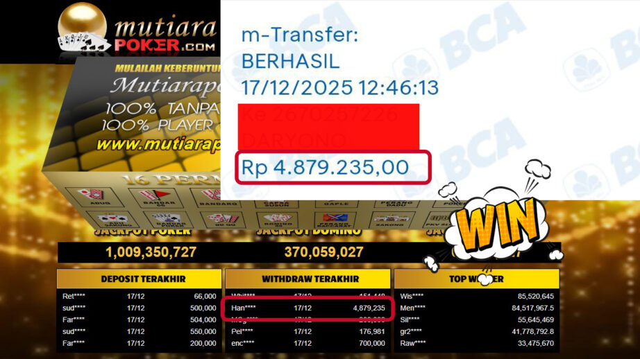 Bukti Withdraw ( 4,879,235,- ) Member Setia MutiaraPoker