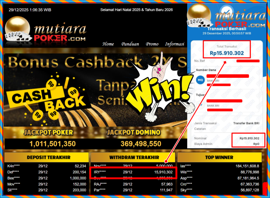 Bukti Withdraw ( 15,910,302,- ) Member Setia MutiaraPoker