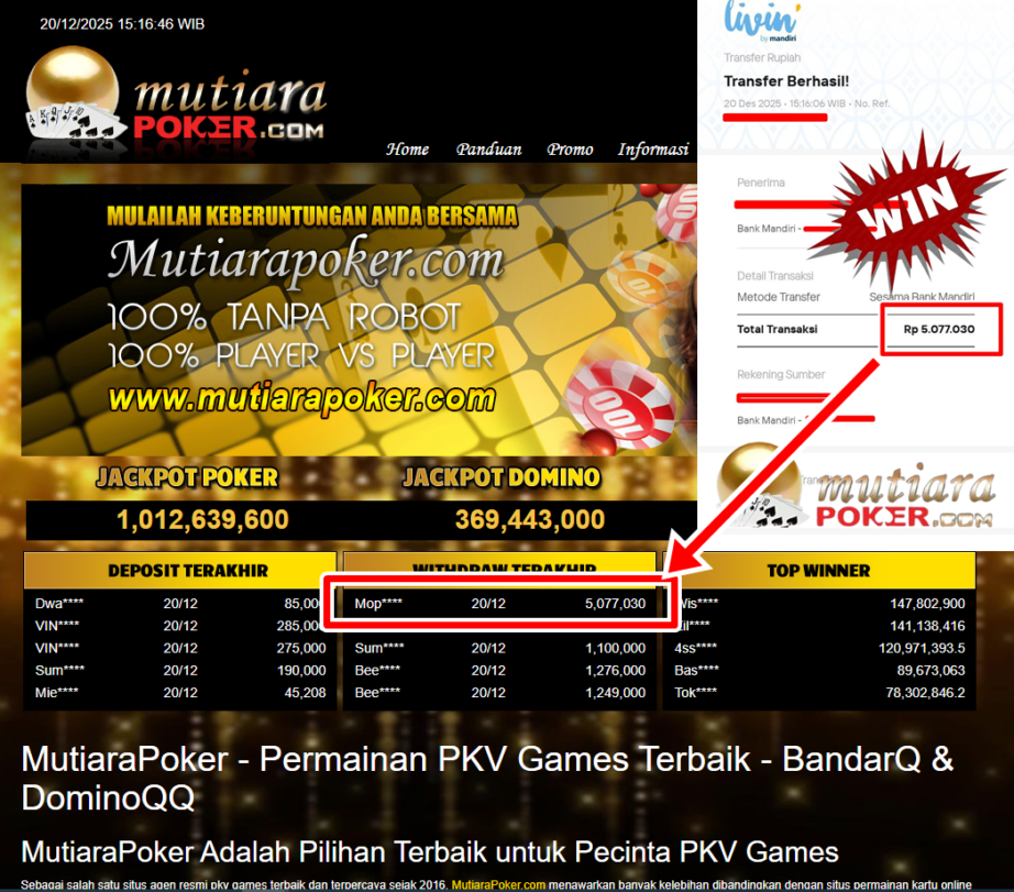 Bukti Withdraw ( 5,077,030,- ) Member Setia MutiaraPoker